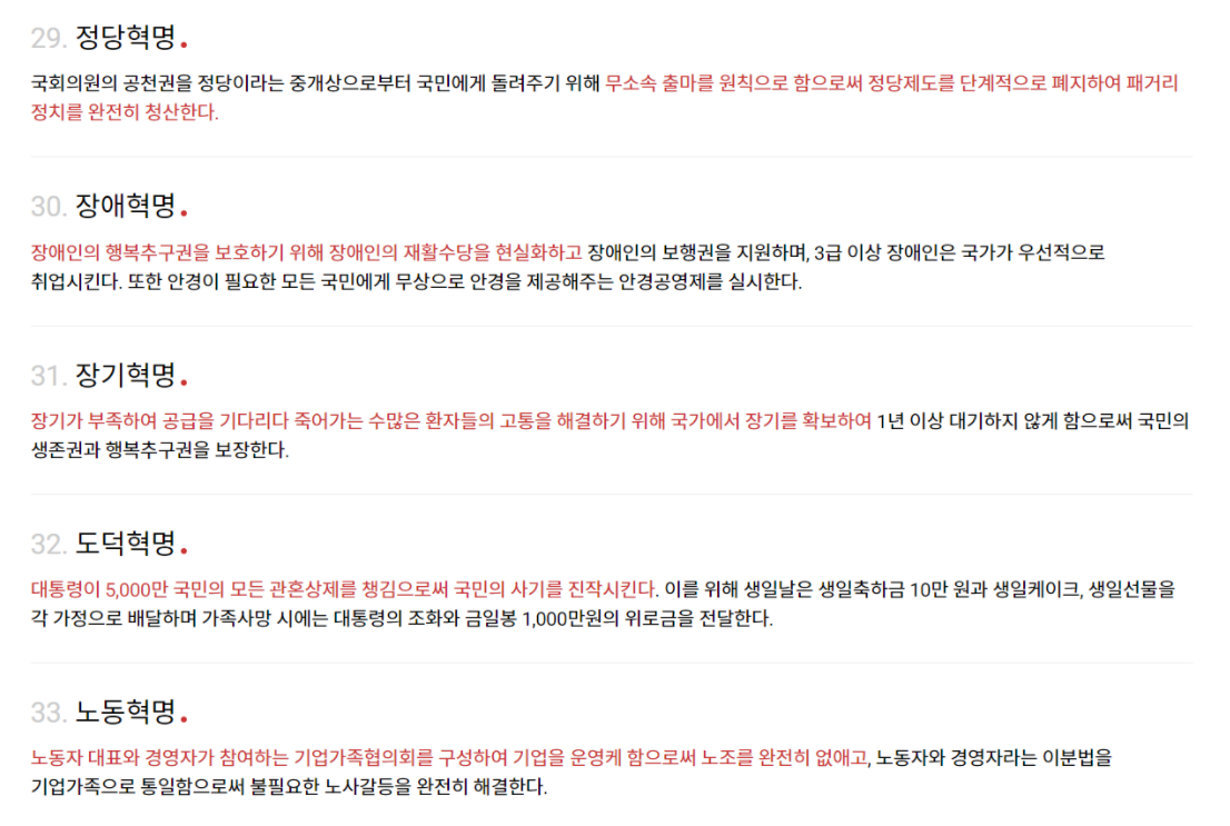 - 6.25, 월남 참전용사와 파독 광부, 파독 간호사에게 각 5억 원과 매월 150만 원을 지급하여 그들의 직계가족에게는 월 150만 원의 참전, 애국 수당을 지급한다.(본인 사망 시에는 직계가족에게 5억 원을 준다.)