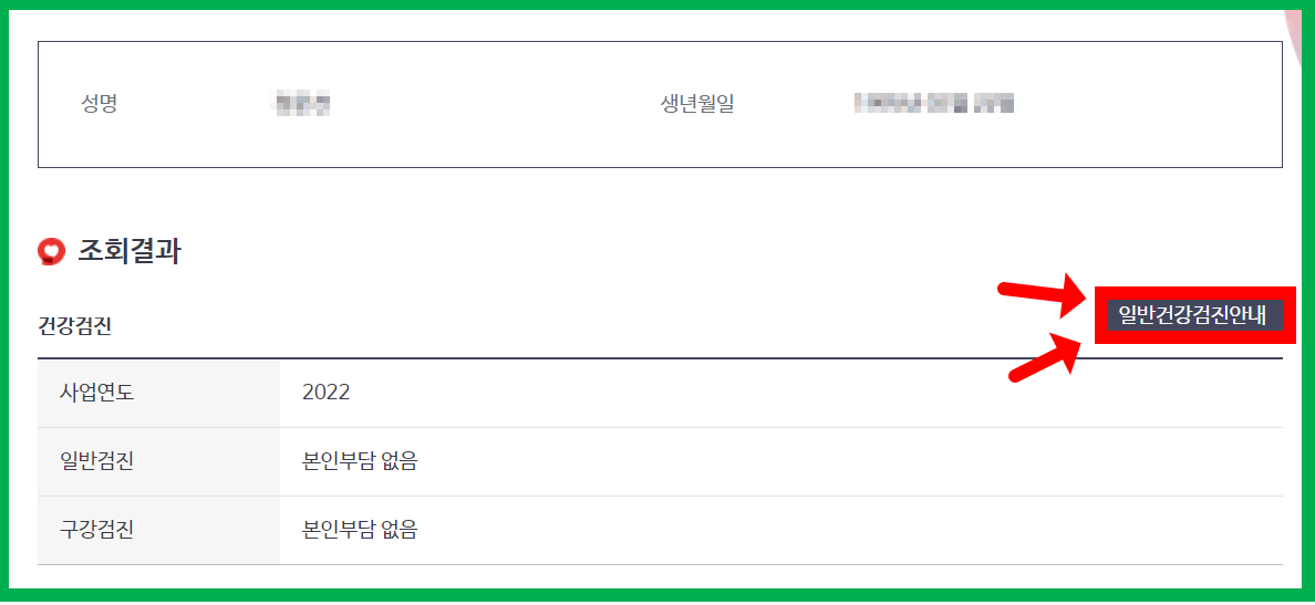 로그인을 하시게 되면 성명 및 생년월일을 확인할 수 있고 일반건강검진안내 탭을 누르시면 어떤 항목을 검사하는지 볼 수 도 있습니다. 공통적으로 검사하는 항목은 신장이나 체중, 허리둘레, 체질량지수, 청력, 시력, 혈압 검사와 AST, ALT, 감마지티피, 공복혈당, 요단백, 흉부방사선 촬영 및 구강검진 등이 있는 것을 보실 수 있습니다.