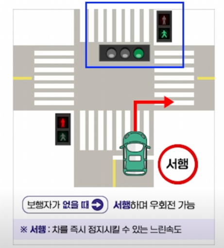 반대로 이 경우에는 전방 차량 신호가 녹색이고, 우회전 횡단보도도 녹색입니다. 이런 경우에는 당연히 지나갈 수 있는데, 단 보행자가 없다는 가정하에 입니다. 또 돌발적인 상황이 나올 수 있기 때문에 서행하면서 우회전을 하면 되는데, 여기서 말하는 서행의 기준은 차를 즉시 정지시킬 수 있는 정도의 속도라고 생각하시면 되겠습니다.