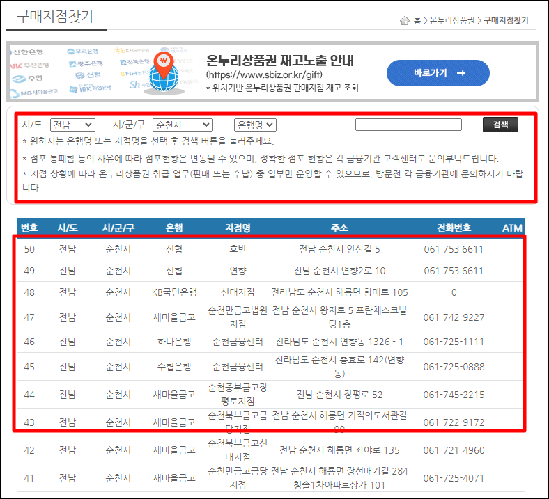 (오)구매지점 찾는 방법도 간단합니다. 아래의 링크를 클릭하여 해당 화면으로 이동 후 거주 중인 시를 선택 후 군/구 선택을 해주고 검색을 누르시면 아래에 은행과 지점명, 주소, 전화번호가 나옵니다. 만약 발급 문의를 하시고 싶다고 하시면 표에 나와있는 전화번호로 직접 통화를 하여 궁금증을 해소하실 수도 있겠습니다.