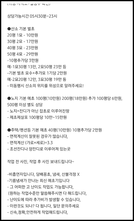위처럼 전체 보기를 클릭하면 벌초대행 가격과 서비스를 어떻게 진행하는지 대략적으로 나와있는 것을 확인할 수 있는데요. 고수가 지금까지 어떤 서비스를 해왔는지 사진과 동영상, 포트폴리오도 준비되어 있기 때문에 둘러보시고 대화로 소통하셔서 가격대가 괜찮고 서비스가 괜찮을 것 같은 고수와 거래를 하시면 되겠습니다. 결제와 서비스 관련은 대화방에서 고수에게 안내를 받으시면 되겠습니다.